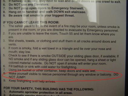 Most of these instructions make pretty good sense, but the “DO NOT JUMP!” in all-caps is a little boggling. As mentioned previously, I’m on the 20th floor. I’m pretty sure that jumping is something that wouldn’t even occur to me unless I were absolutely convinced that agonizing fiery death was, at maximum, about two seconds away. You might as well instruct me “DO NOT FILL TUB WITH WATER AND THEN SUBMERGE FACE IN IT UNTIL ASPHYXIATION OCCURS” or “DO NOT INSERT HEAD INTO DRAWER AND SLAM IT SHUT REPEATEDLY.” Okay, that last one would actually take a long time to kill me, if it’s even possible to die that way. Plus it would probably require outside assistance. But you get the idea.