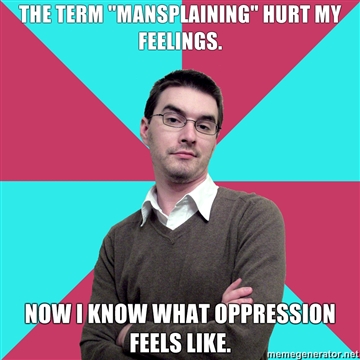 I really wish the term “mansplaining” would go away. I understand the problem it’s meant to convey– a man assuming he knows more about something than a woman and condescending to her about it– but it’s an awkward portmanteau and just strikes me as juvenile. Like there’s no way to effectively point out instances of this happening without coming up with a cute name for it. It also makes it sound as if this is something all men do, or that women never do, or that there aren’t other varieties of prejudice and/or privilege-based condescension. And if there are, do they all need clever names too? Richsplaining? Whitesplaining? “Gaysplaining” sounds marginally better aesthetically, but a person who uses it would probably be called homophobic even if using it correctly because gays are not a privileged group.
