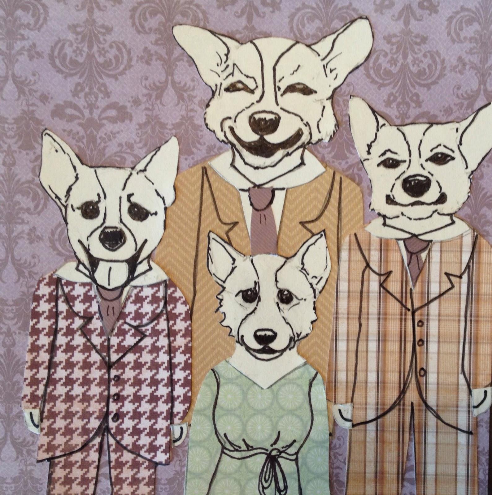 I have two older brothers, who were born in the early 70’s, and I was born in the late 70’s, so I decided that it would be fun to depict everybody in 70’s style semi-formal clothes. I remember a particular photo of us with our dad when I was very young, and everybody was wearing variations on brown and orange. My dad is about 6’4″, so he stood in the middle with his three much shorter children standing around him like Ewoks. Given the constraints of proportion here I wasn’t able to replicate that height difference, but I tried to capture our respective personalities at the time in the faces of the dog family.