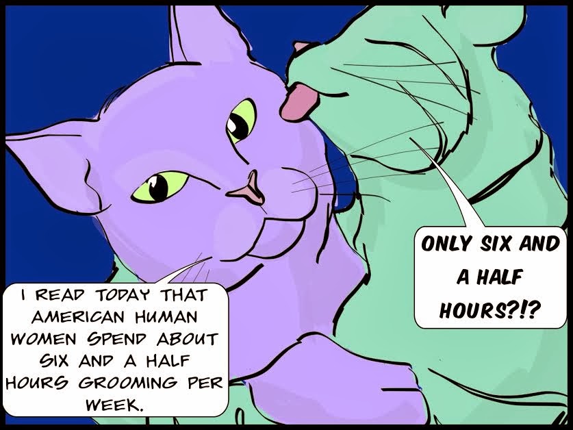 Inspired by: http://www.today.com/health/stop-obsessing-women-waste-2-weeks-year-their-appearance-today-2D12104866 The original headline on NBC’s Today web site is still in the url, though the current headline no longer says that women “waste” this time on their appearances and rather than they “spend” the time, because presumably the former word sounded a tad too judgmental. Although the headline does still instruct us to… Continue reading Cats discussing women grooming