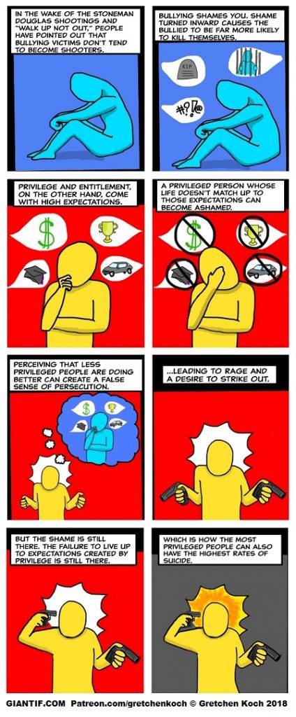 Resources: The male suicides: how social perfectionism kills The Sexist, Racist Implications of the ‘Walk Up, Not Out’ Movement My brush with suicide and the shame of not being a good enough man The conservative persecution complex ‘When You’re Accustomed to Privilege, Equality Feels Like Oppression’