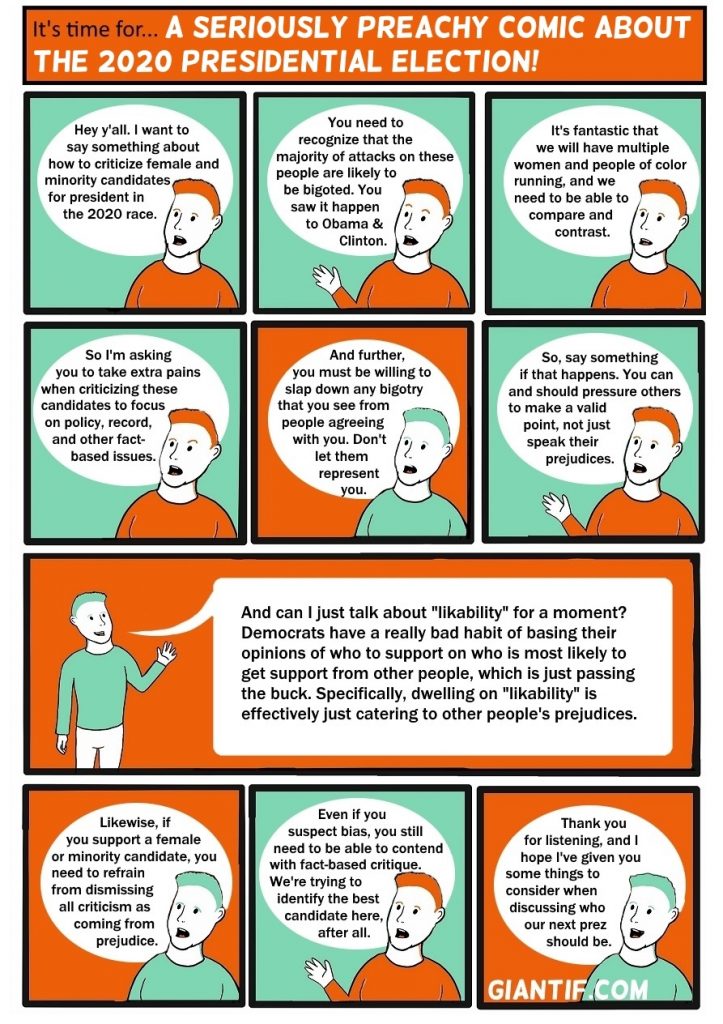 A seriously preachy comic about the 2020 election A seriously preachy comic about the 2020 election published on January 13, 2019Read more posts by the author of A seriously preachy comic about the 2020 election, GretchenNo Comments on A seriously preachy comic about the 2020 election Share this: Share on Facebook (Opens in new window) Facebook Share on Reddit (Opens in new window) Reddit Share on X (Opens in new window) X More Print (Opens in new window) Print Share on LinkedIn (Opens in new window) LinkedIn Share on Tumblr (Opens in new window) Tumblr Share on Pinterest (Opens in new window) Pinterest Share on Telegram (Opens in new window) Telegram Share on WhatsApp (Opens in new window) WhatsApp